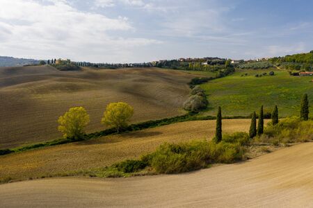 Wavy fields in Tuscany with shadows and farms, Italy. Natural outdoor seasonal spring background with blue sky and clouds.