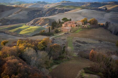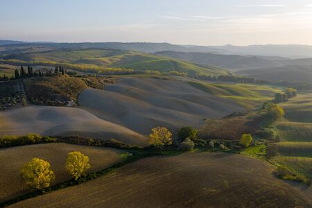 Aerial view of the fields, wineries near San Quirico dOrcia. Tuscany autumn sunrise