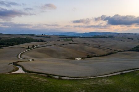 Aerial view of the Crete Senesi, near Asciano, Tuscany at sunset