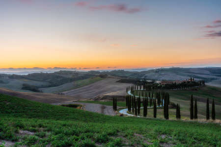 ASCIANO, ITALY - JUNE 23: Scenic sunset over one of the most iconic landscapes with cypresses in Tuscany, near the town of Asciano, province of Siena, Italy, as seen on June 23, 2019