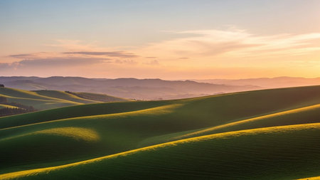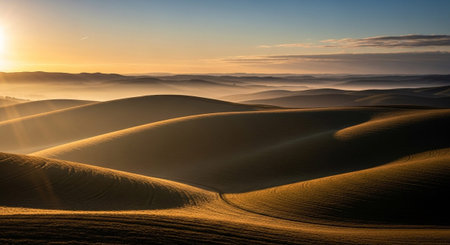 A panoramic view of gently rolling hills bathed in the warm, golden light of sunrise. Soft fog and mist weave through the valleys, creating layers of depth and an ethereal atmosphere. The contours of the fields are highlighted by the low-angle sun, casting long shadows and emphasizing the undulating landscape. The sky is a soft gradient of colors, with a few wispy clouds.