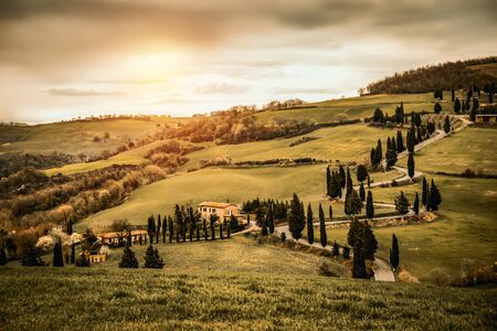 Villa in Tuscany with cypress road, idyllic seasonal nature landscape vintage background