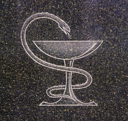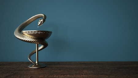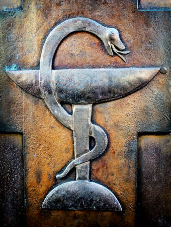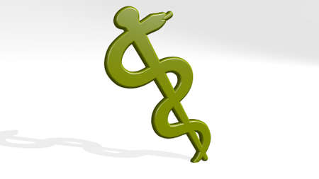 MEDICAL SNAKE SIGN made by 3D illustration of a shiny metallic sculpture with the shadow on light background. care and doctor