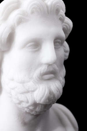 Head and shoulders detail of the ancient sculpture. Isolated on black background