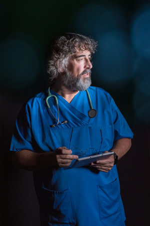 mature doctor with a beard dressed in a blue operating room suit on a black background healthcare medical professions