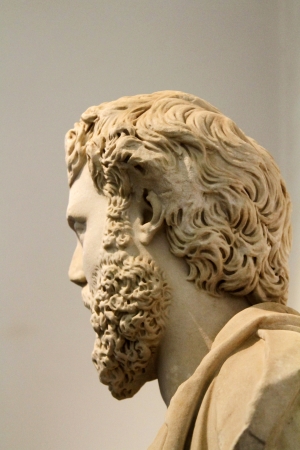 A sculpture of a wise man with flowing hair and a beard gazes thoughtfully into the distance.