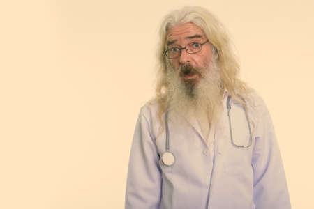 Studio shot of senior bearded man doctor looking shocked while wearing eyeglasses