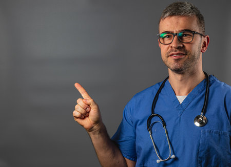 A healthcare professional in blue scrubs points upward, engaged in a discussion about patient care. The backdrop is neutral, enhancing focus on the doctor’s expression.