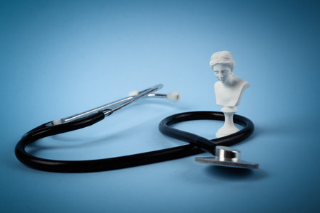Stethoscope with antique bust of venus on blue background. medical composition. Minimal still life