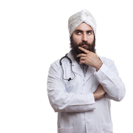 pensive experienced doctor with a beard on a white background