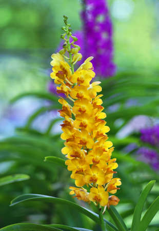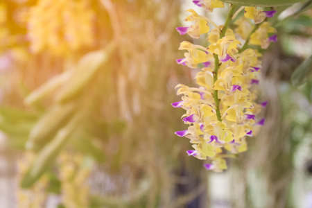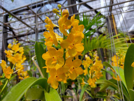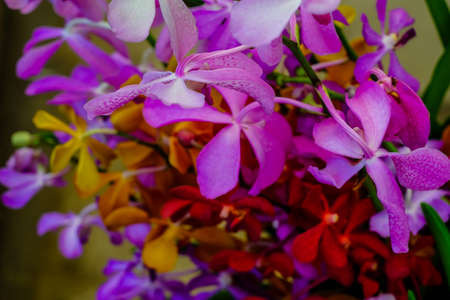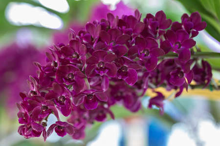 Orchid flower in orchid garden at winter or spring day for postcard beauty and agriculture idea concept design. Vanda denisoniana orchid or Ascocenda Kenny Gold orchid.