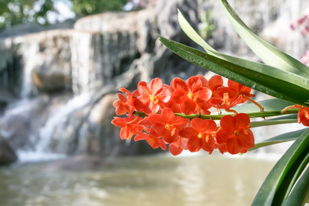 Orange orchids are blooming nature. The waterfall in the background