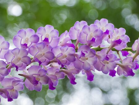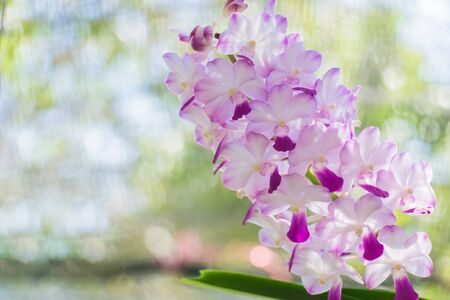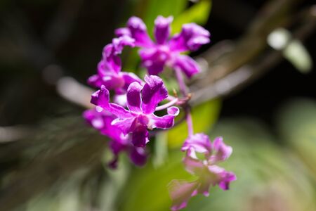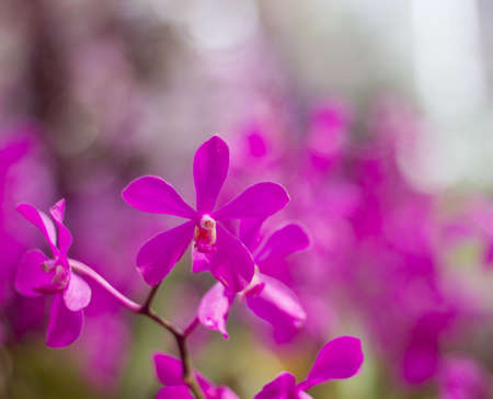 Sweet purple orchids in soft color and soft blurred style, on natural blur background, in Thailand. Macro.