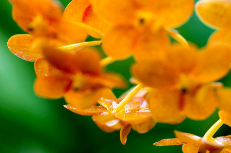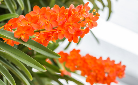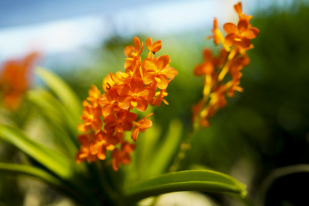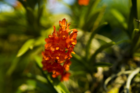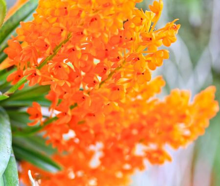 Beautiful orange orchid, Ascocenda in farm, in soft blurred style, with green leaves, on vintage background, in Thailand. Macro.