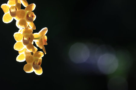 Close up transparency small yellow orchid flowers and white bokeh on green and black background