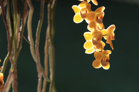 Close up transparency small yellow orchid flowers and grey root on green background