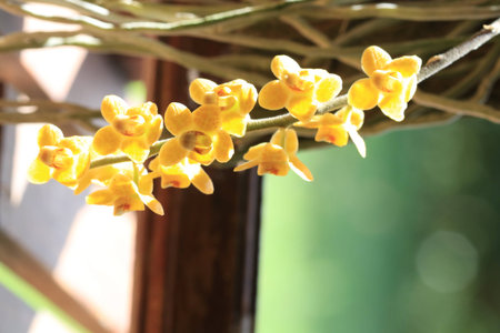 Close up transparency small yellow orchid flowers and white bokeh on brown and green background