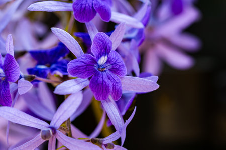 Extreme closeup selective focus of blooming purple wreath flowers or sand paper vine flowers (Scientific name is Petrea volubilis) on dark background.
