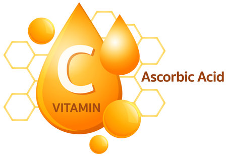 Bright orange vitamin C droplets with hexagonal molecular structure, flat vector style, white background