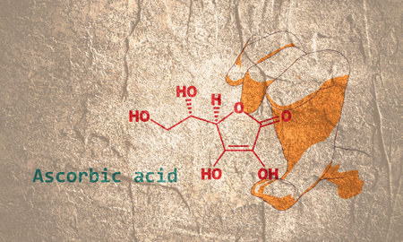 Infographics illustration. Hand holding formula of ascorbic acid.