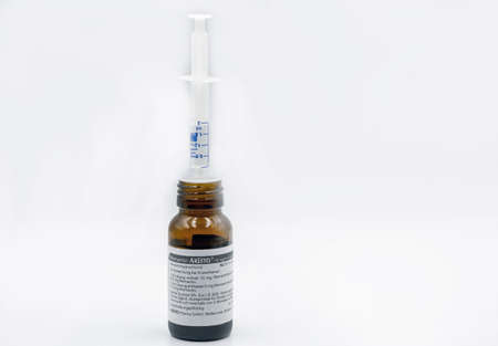 KYIV, UKRAINE - DECEMBER 24, 2020: Studio shoot of Memantine Aristo syrup closeup against white background. It is a medication used to treat moderate to severe Alzheimer's disease.