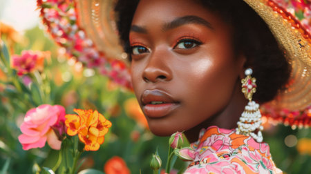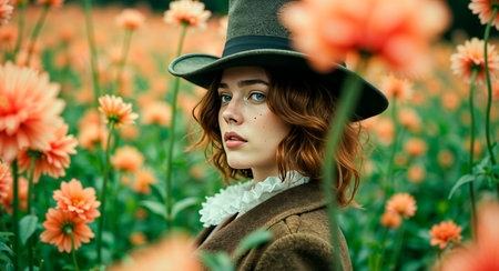 A close up of a woman in an ornate hat with flowers, AI