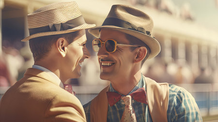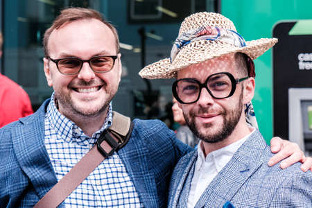 Epsom Surrey, London UK, June 04 2022, Happy Smart Gay Couple Cazoo Epsom Derby