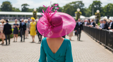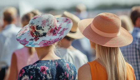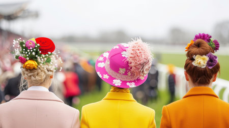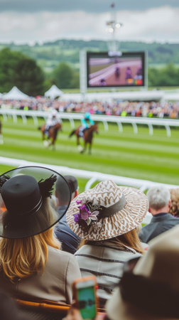Two women with elegant hats enjoying horse racing competition at the racecourse on a sunny day