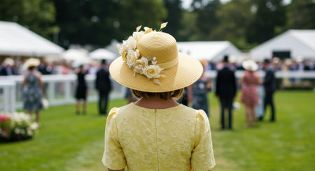 Rear view of a woman in a yellow dress and a large straw hat adorned with white flowers, attending an elegant outdoor event on a sunny day. Blurred crowd and white tents are visible in the background.