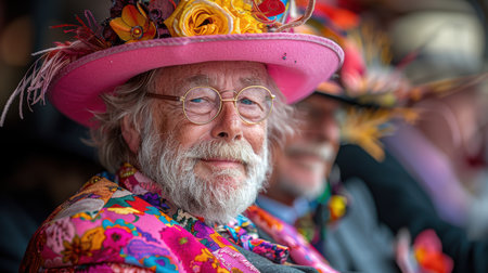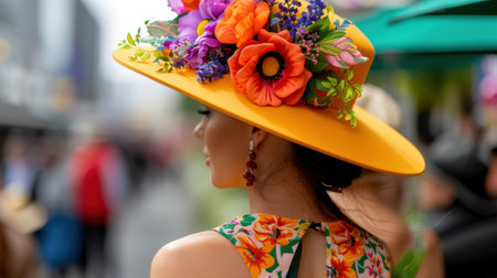 A lovely woman showcases style and elegance while wearing a vibrant floral dress and a dazzling hat adorned with colorful flowers at an outdoor event.