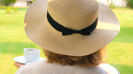 female in a straw hat holds a cup of hot drink and drinks coffee, sitting in the morning on a summer terrace on a sunny day. The concept of good morning, travel and expectation of new changes, dreams, plans for the future. rear view, close-up