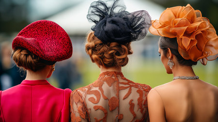Horse racing event, viewed from behind three women dressed in stylish, elaborate hats