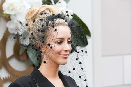 Lady wearing fancy hat arrive at Racecourse.