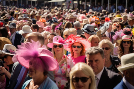 A large group of people wearing a variety of hats and sunglasses outdoors, crowd people in Melbourne cup day, AI Generated