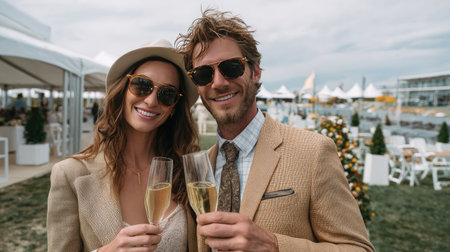 A fashionable couple enjoys a cheerful moment together at an outdoor event, toasting with sparkling champagne in a picturesque setting.