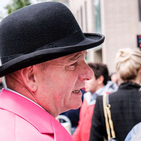Epsom Surrey, London UK, June 04 2022, Senior Man Wearing Traditional Bowler Hat And Bright Pink Jacket