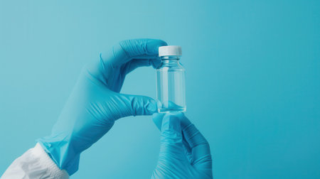 Medical gloves hold a vial containing a clear liquid captured against a solid blue background, emphasizing sterile preparation for use.