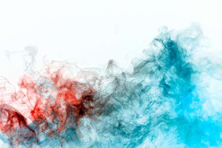 Multicolored curling smoke, red blue vapor, curled into abstract shapes and patterns on a white background, repeating the movement of waves and a chemical.