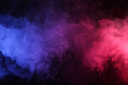 Artificial smoke in red-blue light on black background in darkness