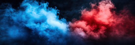 Red and blue smoke intertwining on a dark background