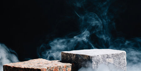 Stone pedestal or platform with smoke on black background for product display