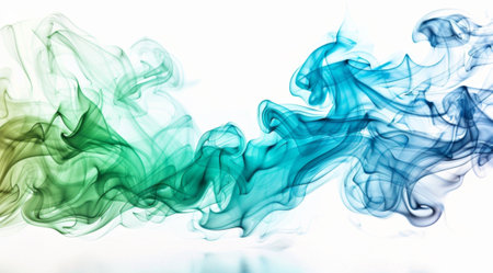 Waves of green and blue smoke create an ethereal and fluid form on a white background, suggesting graceful movement.