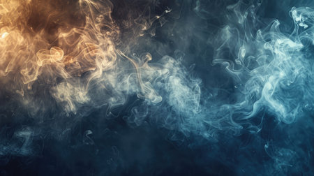 Vibrant blue and golden smoke swirls dynamically, creating an ethereal and abstract pattern against a dark background. The colorful plumes gracefully intertwine. AI-generated content