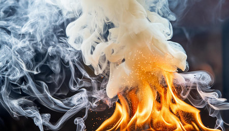 A visually striking image featuring orange, white, and blue smoke clouds against a dark backdrop, creating a dramatic and artistic effect.
