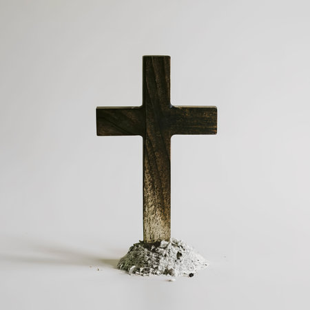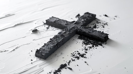 Ash cross symbol on white background representing spirituality, faith, remembrance, and solemn religious observance.