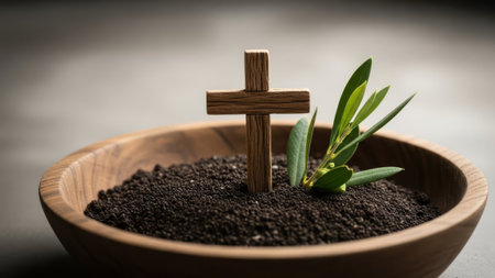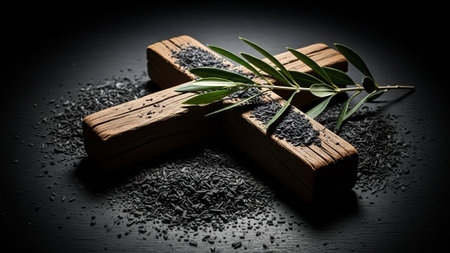 Wooden cross, ash, olive branch, dark background, religious symbol.