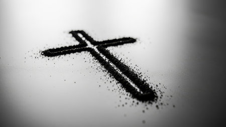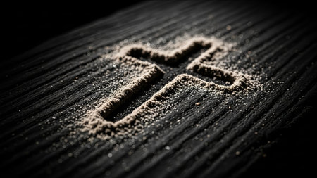 A cross shape formed in scattered ashes on a dark textured background represents the symbolic meaning of Ash Wednesday and repentance.