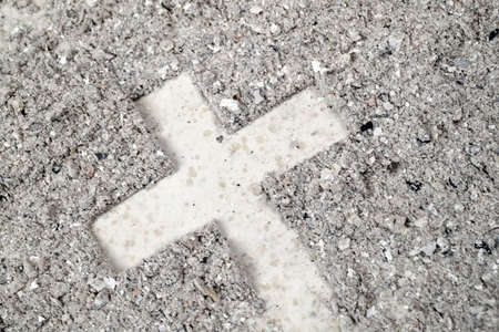 Christian cross or crucifix drawing in ash, dust or sand as symbol of religion, sacrifice, redemption, Jesus Christ, ash wednesday, lent, Good Friday, Easter with Church is devoted to fasting