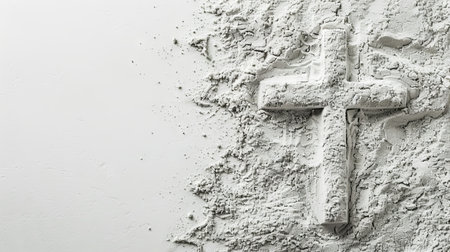 Ash-covered white cross on white background. Concept of spirituality, Lent, Christian rituals, religious, Easter celebration, ash Wednesday, resurrection, cremation, funeral, liturgy Copy space