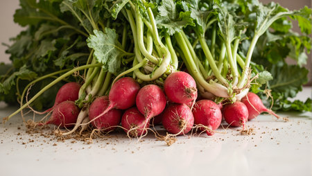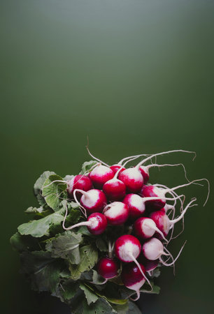Bundle of fresh radishes with lush green leaves, natural beauty of organic produce, healthy eating and cooking at home.